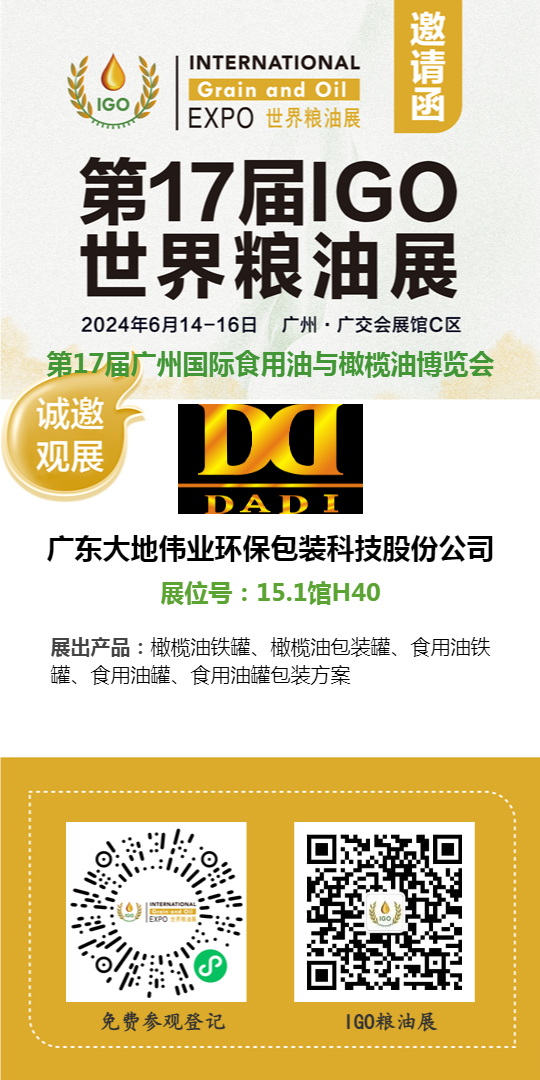 作為本次展會的參展商之一,廣東大地偉業(yè)環(huán)保包裝科技股份公司深感榮幸。我們將攜帶一系列最新產(chǎn)品亮相展會,包括高品質(zhì)的橄欖油鐵罐、橄欖油包裝罐、食用油鐵罐以及創(chuàng)新的食用油罐包裝方案。我們的展位號為15.1館H40,期待與您進行深入的交流和合作。
