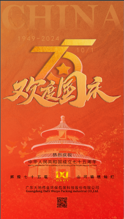 國(guó)慶節(jié)是中華人民共和國(guó)成立的紀(jì)念日,也是全國(guó)人民共同歡慶、展現(xiàn)國(guó)家繁榮昌盛的重要時(shí)刻。廣東大地偉業(yè)環(huán)保包裝科技股份有限公司祝您和您的家人享受愉快的假期,感受國(guó)家的繁榮與強(qiáng)大,共同度過一個(gè)難忘而美好的節(jié)日!