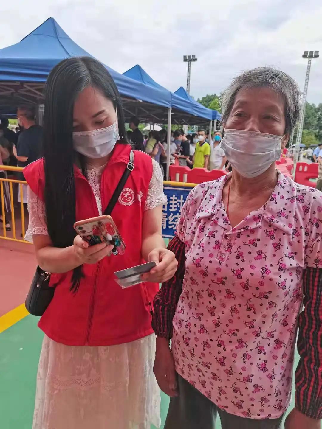 在核酸檢測(cè)地的現(xiàn)場(chǎng),不少大地黨群志愿者,頂著烈日,為群眾指引、解釋核酸流程與方法。有些老人,沒有自己的粵康碼,志愿者們就用自己的手機(jī)為其耐心注冊(cè)。“看一下您的粵康碼”、“隊(duì)伍請(qǐng)跟上”、“掃描這里登記您的信息...”這些簡(jiǎn)單的話語就這樣隨著核酸隊(duì)伍的前進(jìn)重復(fù)了千百遍。