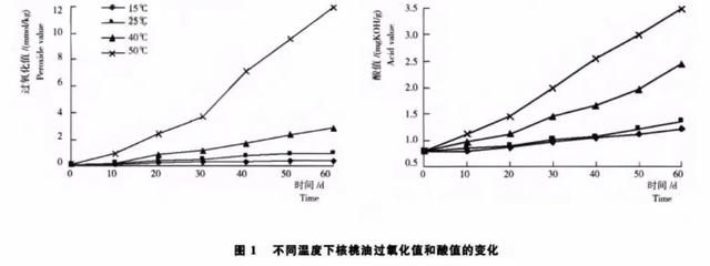 實驗一:溫度試驗,核桃油裝人無色玻璃瓶,密封,分別在15℃、25℃、40℃和50℃條件下避光保存。