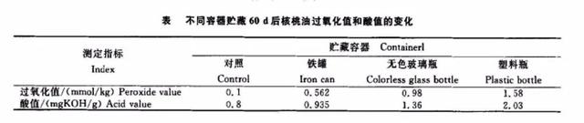 實驗三:容器材料試驗,核桃油分別裝入馬口鐵罐、無色玻璃瓶和塑料瓶,在室溫下保存。
